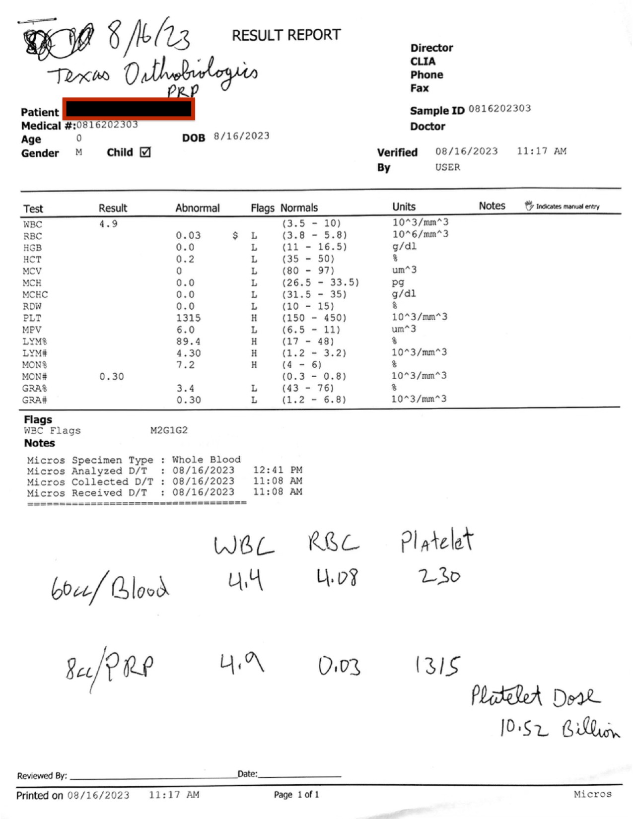 Below is a printout showing how we run the before and after for a PRP treatment. In this example the calculated PRP dose is 10.5 Billion platelets delivered in 8cc of PRP.